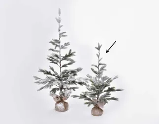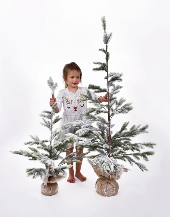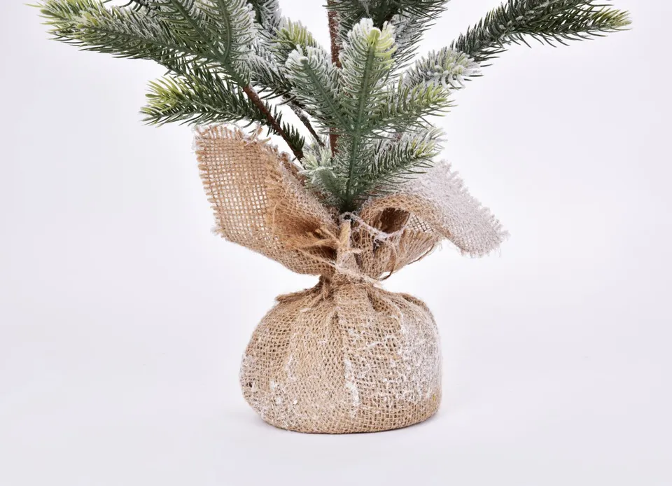 Téli mese, amely soha nem olvad el. Ez a kisebb havas fenyőfa ideális választás a természetes dekorációk kedvelőinek – tökéletesen illik az asztalra, komódra vagy gyerekszobába. A finoman hófödte ágak frissen hullott hó érzését keltik, és a jutalap alapot hangsúlyozza rusztikus stílus. Még egy kis fa is képes beragyogni az egész szobát a téli nyugalommal és szépséggel.