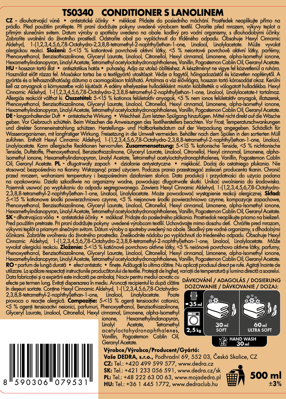 A LANOLINO kondicionáló lanolinnal gyengéd kondicionáló a gyapjú és a kényes vászon számára. Puhítja a szálakat, visszaadja rugalmasságukat és védi őket a kiszáradástól. Semlegesíti az elektrosztatikus töltést, megkönnyíti a vasalást, és minden mosás után puha, illatos és friss ruhát hagy.