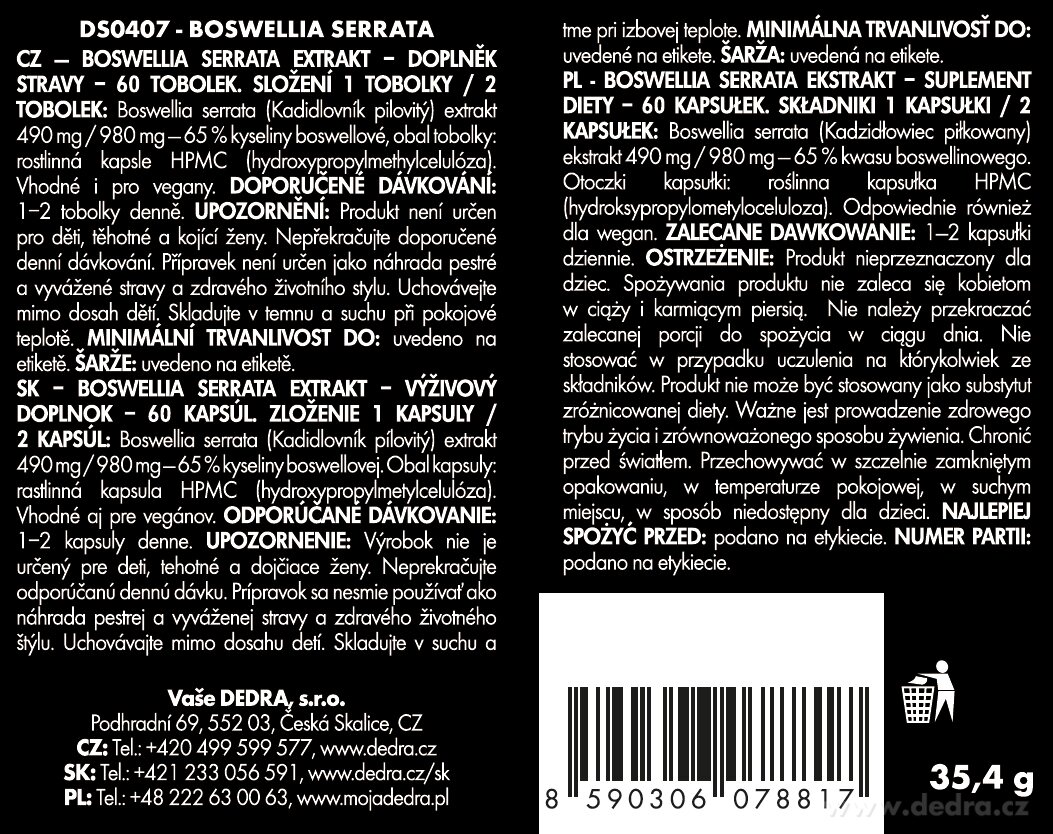 - 1x BOSWELLIA SERRATA 490 mg, standardizált kivonat (65 % boswellia sav) ízületekhez, 60 kapszula