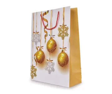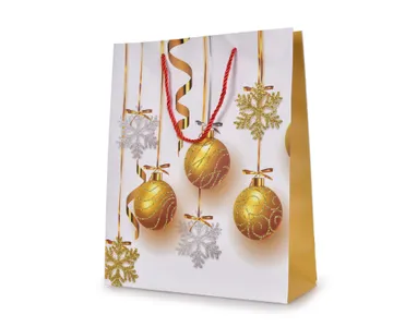 Arany golyók és hópelyhek fehér háttérrel | ajándék tasak L