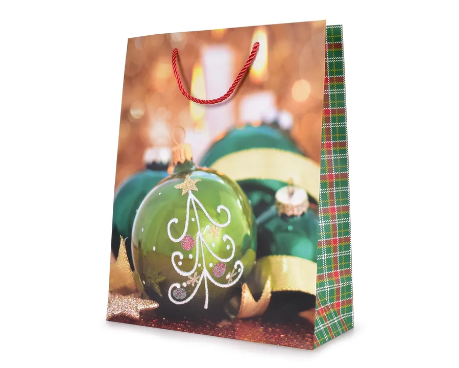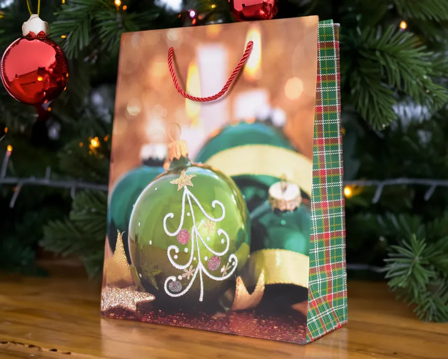 Nagyméretű karácsonyi ajándéktáska zöld golyók, gyertyák és csillogó részletek mintájával. Arany csillámok, kemény karton, piros zsinóros fül. Méretek: 26 × 10 × 32 cm. Elegáns csomagolás nagyobb ajándékok számára.