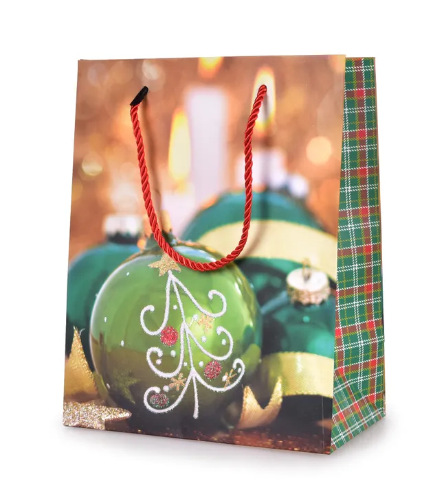 Kicsi ajándékzacskó zöld karácsonyi gömbökkel, gyertyákkal és dekormintával, arany csillámokkal díszítve. Szilárd karton, zsinóros fül, méretek: 18 × 10 × 23 cm. Elegáns csomagolás kisebb ajándékokhoz.