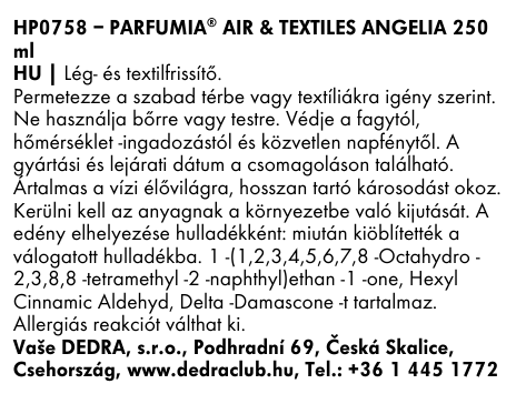 A luxus PARFUMIA® légfrissítő és textilparfüm prémium parfümmel. Frissíti a törölközőket, függönyöket és a ruhákat finom és tartós illattal. Elegáns spray, amely univerzális használatra készült a mindennapi otthoni frissítéshez. Őrtartalma 250 ml.