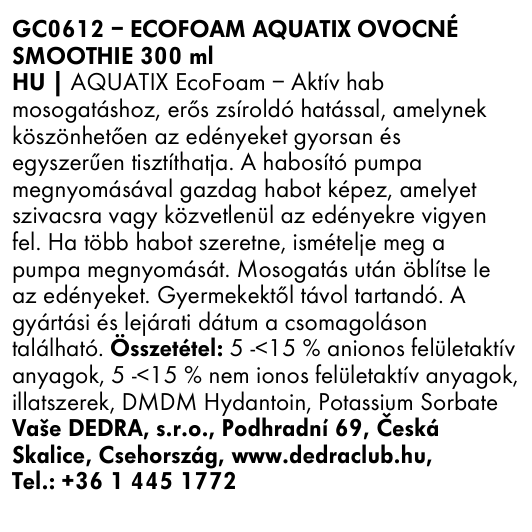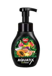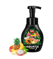 AQUATIX® EcoFoam egy aktív hab kézi edénymosáshoz, amely a forradalmi habosító technológiának köszönhetően sűrű habot készít azonnal a pumpa megnyomásával – víz vagy szivacs dörzsölésének szüksége nélkül. Hatékonyan távolítja el a zsírt és a szennyeződéseket, és fényesen tiszta edényeket hagy maga után zárólagosan tiszta. Ráadásul egy kellemes gyümölcsös, egzotikus illatot idéz, amely a smoothie-ra emlékeztet.
