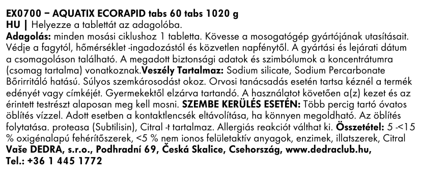 - Rövid programokhoz (30 perc) a tablettát a mosogatógép aljára helyezd, vagy használj ECORAPID AQUATIX gélt.
