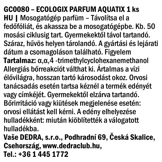 AQUATIX® PARFUM egy felfüggesztett illat a mosogatógépekhez, intenzív citrus illatosítással, amely hatékonyan semlegesíti az ételmaradékok és piszkos edények által képződő szagokat. Ideális, ha a mosogatógép hosszú ideje nem használatos, amikor is kellemetlen szagok halmozódhatnak fel a belsejében. A felfüggesztő konzol lehetővé teszi a könnyű telepítést közvetlenül a mosogatógép kosarára.
