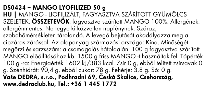 Összetevők: 100% fagyasztva szárított mangó. Allergenementes. Ne érje közvetlen napfény. Száraz, szobahőmérsékleten tárolandó. Zipper zárással zárja le a levegő bejutását.