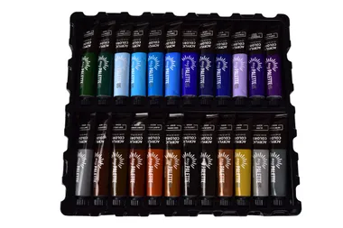 48 db XXXL EXKLUZÍV AKRILIS FESTÉK KÉSZLET tartozékokkal, alumínium tubusokban, vízbázisú, nem toxikus, gyorsan száradó. A csomag tartalmaz 6 különböző méretű ecsetet, 1 műanyag palettát a színek keveréséhez. Kemény kartondobozban csomagolva. Egy tubus térfogata 22 ml. Csomag mérete: 29 széles x 26 mély x 6 cm magas.
