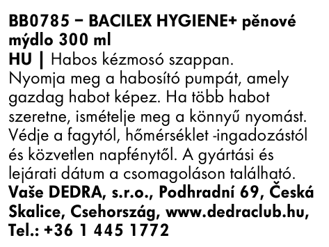 BACILEX® HYGIENE+ habzó szappan hatékony higiénikus gondoskodást ötvöz a bőr gyengédségével. Tartalmaz egy természetes növényi savak széles spektrumú antimikrobiális aktivitású keverékét, aktív habformáló anyagokat és Aloe Vera kivonatot, amely segít megőrizni a bőr hidratáltságát és puhítását. A forradalmi habpumpának köszönhetően gazdag hab keletkezik azonnal, és akár 3× tovább tart, mint a hagyományos szappanok.