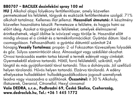 Fertőtlenítő spray sima felületekre, 71% alkoholtartalommal, BACILEX FERTŐTLENÍTŐ SPRAY, 100 ml, kellemes virágos illattal.