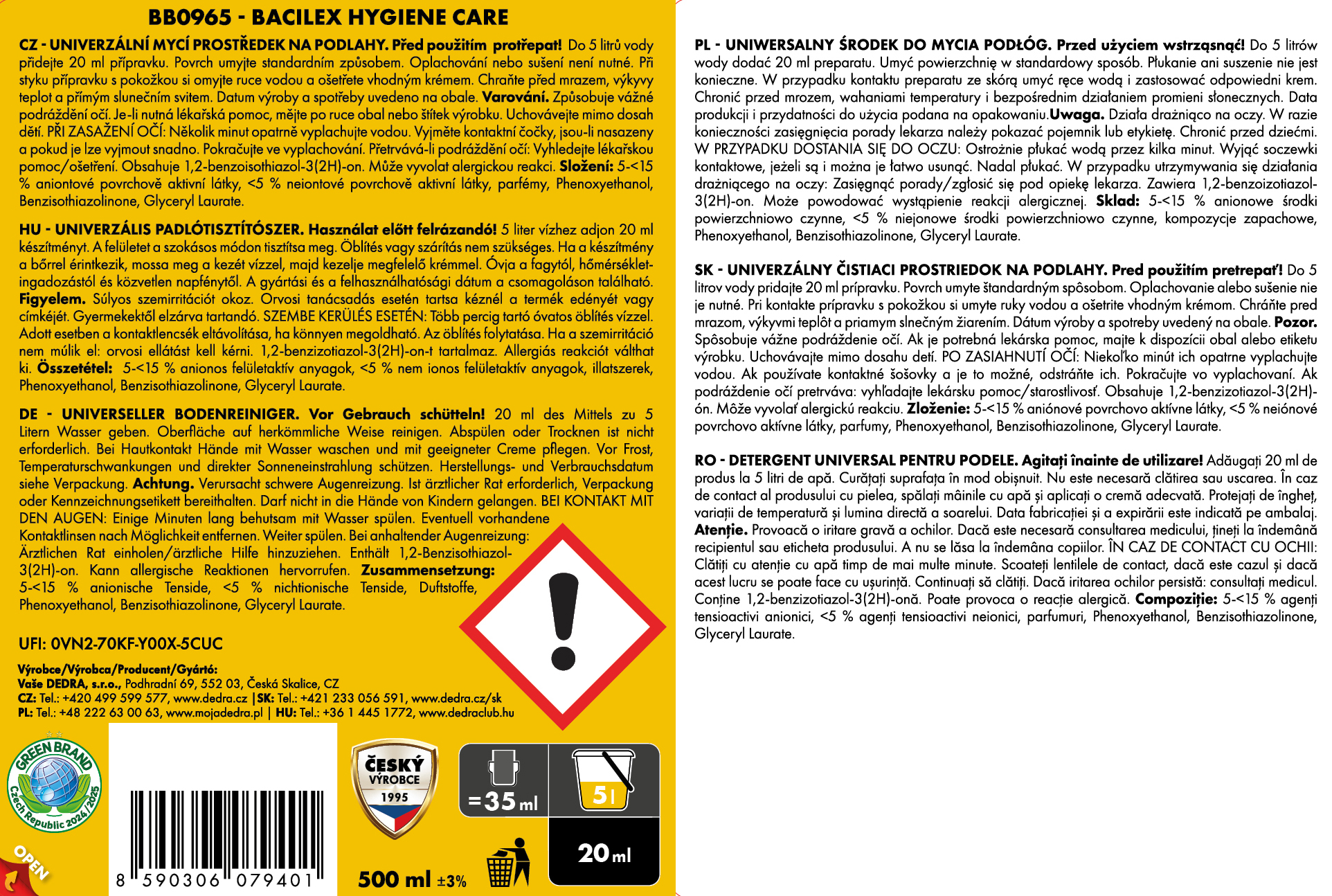 A BACILEX HYGIENIC FLOOR CARE egy univerzális padlótisztító koncentrátum 500 ml-es kiszerelésben, friss mangó illattal. Hatékonyan eltávolítja a szennyeződéseket és zsírokat, nem hagy foltokat, biolebomló összetevőket tartalmaz, és PFAS-mentes. Alkalmas csempére, laminált padlóra, PVC-re és más tisztítható felületekre.