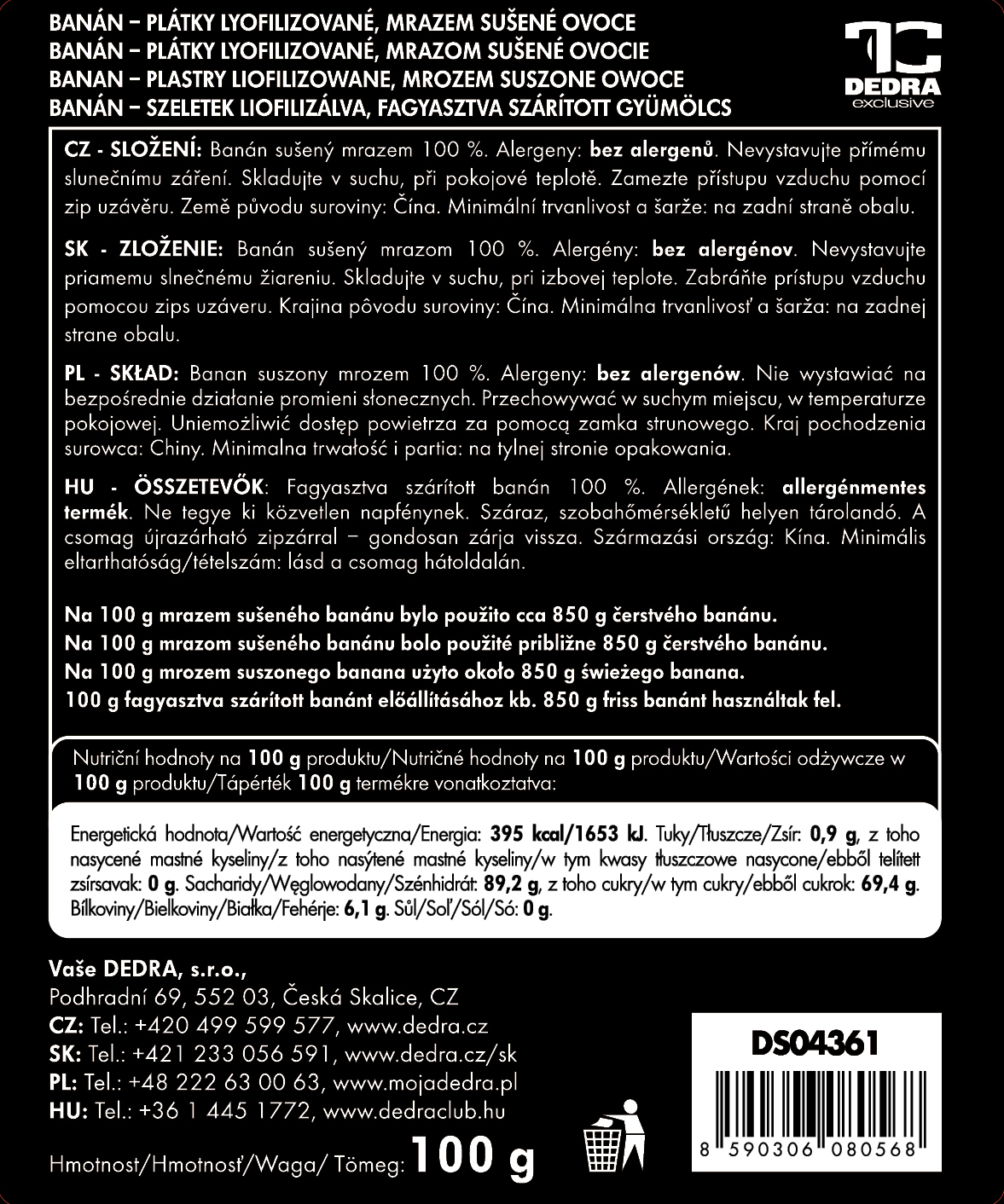 Összetevők: fagyasztva szárított banán 100 %. Allergén anyagokat nem tartalmaz. Ne tedd ki közvetlen napfénynek. Tárold száraz, szobahőmérsékleten. Használj légmentes zárást.