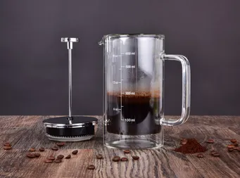 – Anyag: boroszilikát dupla falú üveg + rozsdamentes (dugattyú/szita)