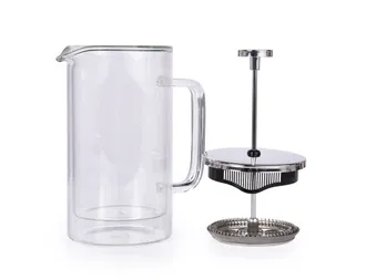 Dupla falú French Press 600 ml boroszilikátüvegből és rozsdamentes acélból kávé és tea elkészítéséhez, zsír nélkül. Hosszú ideig megtartja az ital hőmérsékletét, mosogatógépbe és mikróba is alkalmas – stílusos kiegészítő a házi barista számára.