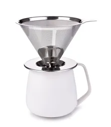 Az alsó szélesített rész jól illeszkedik a bögrekhez, csészékhez és kannákhoz 5,5 - 9,3 cm átmérőig. A praktikus fogantyú megkönnyíti a kezelést, a szűrő a víz öntésekor való tartását. Rozsdamentes acélból készült, többször felhasználható.