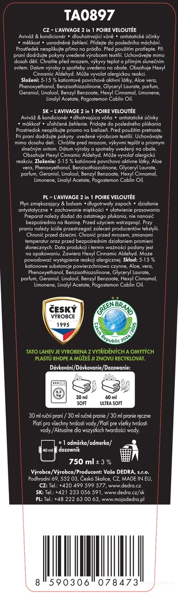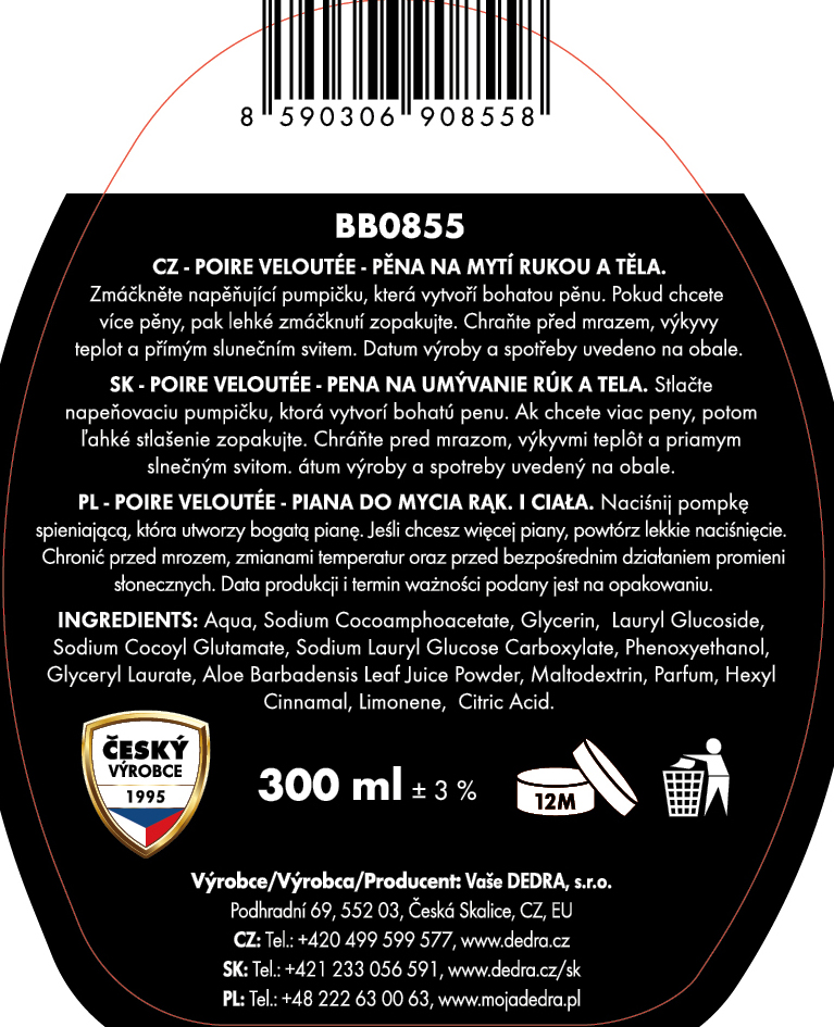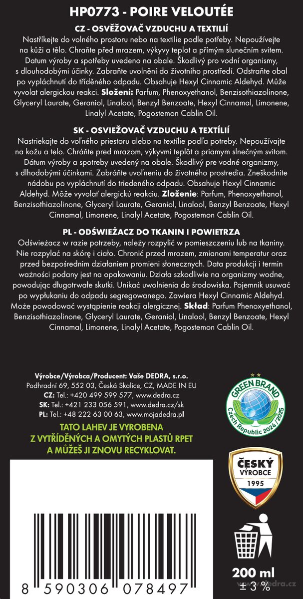 A BÁRSONY KÖRTE készlet egyesíti a öblítőt, a levegő- és textilfrissítőt, a mosási és takarítási parfümöt, valamint a habzó szappant a testre és a kezekre. Borítsd be otthonodat, ruháidat és bőrödet az ízletes körte és a finom virágok édességével.