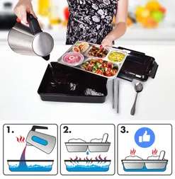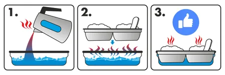 2) Önts egy kis meleg vizet a műanyag alsó tárolóba a vízforralóból. Csak egy kicsit, hogy a víz ne folyjon ki! Ezután helyezd el a rozsdamentes tányért az étellel, és várj egy kicsit, amíg az étel felmelegszik. Ebben az esetben légy óvatos a szállításnál, és vedd figyelembe a forró vizet a BENTO BOX-ban. Ismét, a rozsdamentes acél nagyon gyorsan vezeti a hőt.