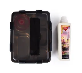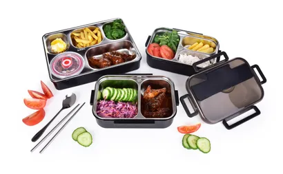 BENTO BOX 5 az 1-ben (1 250 ml) egy luxus rozsdamentes acél ételtároló öt rekesszel (450 ml + 150 ml + 250 ml + 150 ml + 250 ml), amely lehetővé teszi, hogy a teljes menüt: főétel, saláta, köret és mártás – külön-külön és higiénikusan szállítsa. A szilikon tömítésnek és a 4 klipsznek köszönhetően szállítás közben nem nyílik ki és nem ömlik ki, az étel friss marad. A belső rozsdamentes acél rész eltávolítható a könnyű tisztítás érdekében. Része egy rozsdamentes evőkanál, pálcika és egy 200 ml-es tároló fedővel.