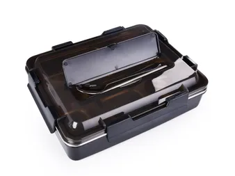 5 az 1-ben Rozsdamentes doboz, praktikus tároló kefézett rozsdamentes acélból élelmiszerek szállítására, átlátszó műanyag fedéllel szilikon tömítéssel és 4 klipszel a szoros rögzítéshez. Alkalmas fagyasztóba, hűtőbe és mosogatógépbe. Méretek: szélesség 28 x magasság 23 x mélység 7,5 cm, evőeszköz hossza kb. 18 cm.