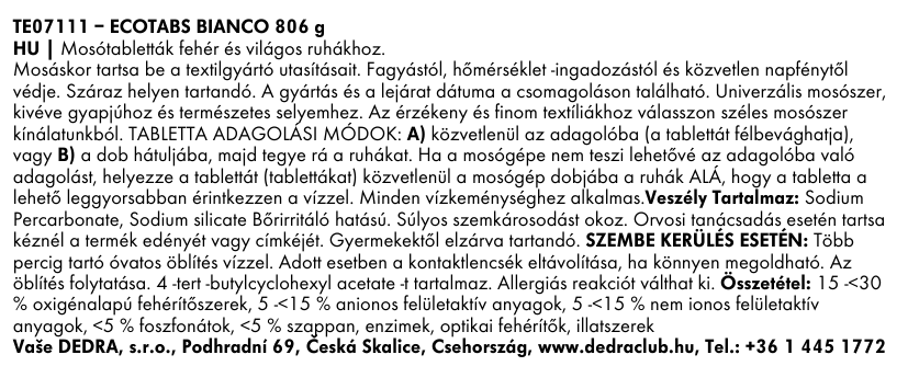 A BIANCO ECOTABS nagyon hatékony mosótabletták fehér ruhákhoz OXYDOO fehérítő összetevővel és bioenzimekkel. Megbirkózik a makacs foltokkal – vér, izzadság, fű, gyümölcs – még alacsony hőmérsékleten is. A tabletták villámgyorsan feloldódnak, és nem hagynak maradványokat. A fehérség kompromisszumok nélkül, már az első mosás után.