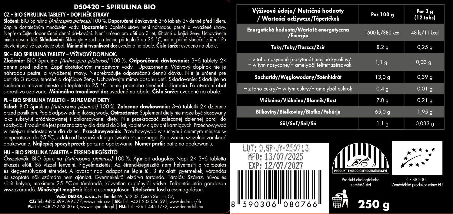 Összetétel: BIO Spirulina (Arthrospira platensis) 100%. A tabletták préseléssel készülnek, adalékanyagok hozzáadása nélkül.