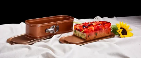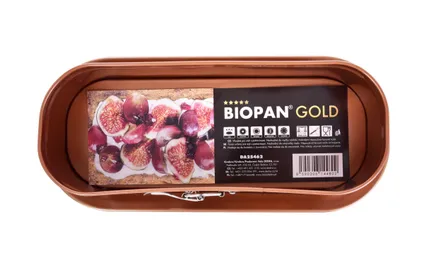 Nagyméretű ovális szétnyitható forma szilárd acélból arany-vörös prémium tapadásmentes felülettelBIOPAN® GOLD – ideális sült és nem sült finomságokhoz. Ez a felület biztosítja atökéletes étel eltávolítást, magas ellenállóságot a kopással szemben és a könnyű tisztítást. A fém csat lehetővé teszi a keret egyszerű levételét, a praktikus alj pedig szolgál a kényelmes szállításhoz és stílusos tálaláshoz.