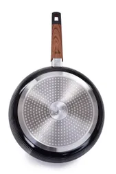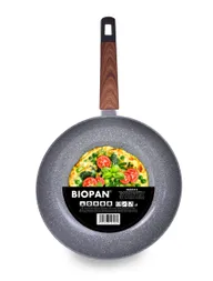 Nagy BIOPAN® WOODOO serpenyő Ø 28 cm 2,6 L űrtartalommal és SALT&PEPPER kerámikus borítással, kőhatással. SOFT TOUCH fa hatású fogantyú, minden főzőfelületen használható, beleértve az indukciót is. PTFE és PFOA mentes.