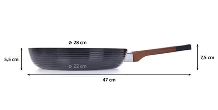 A serpenyő masszív alumínium ötvözetből készült, ami gyors és egyenletes hőeloszlást biztosít. A látványos, dombornyomott fényes felület eleganciát kölcsönöz, míg a SOFT TOUCH fa hatású, csúszásmentes hőszigetelő fogantyú kényelmes és biztonságos fogást garantál.