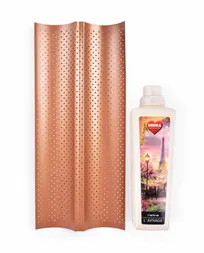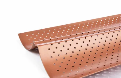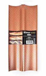BIOPAN® GOLD perforált forma 2 bagettához 38 cm hosszúsággal, tapadásmentes felülettel a egyenletes sütéshez és ropogós kérgéhez. A domború forma segít a bagetták ideális pozíciójának fenntartásában. Könnyű tisztítani, PFAS mentes, minden típusú sütőbe alkalmas.