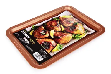 Alacsony BIOPAN® GOLD 38 × 26,5 cm-es tepsi tapadásmentes felülettel, amely megkönnyíti a péksütemények és húsok kiemelését. Ideális sütemények, piték, édességek, sült húsok és zöldségek sütésére. Tartós, könnyen tisztítható, PFAS-mentes, minden típusú sütőben használható.