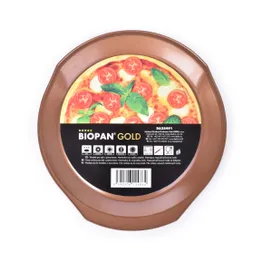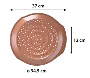 BIOPAN® GOLD perforált pizza- és hasábburgonya-lemez Ø 34,5 cm. Tapadásmentes felület az egyszerű eltávolítás érdekében, perforáció a ropogós alsó részért. Ideális pizza, hasábburgonya, péksütemények és élelmiszerek szárítására.