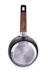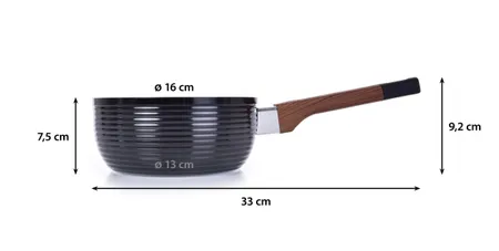 A serpenyő tömeges alumínium kivitelben készült a hő egyenletes vezetéséért, figyelemfelkeltő fényes külső felülettel és csúszásmentes hőszigetelő SOFT TOUCH fogantyúval, amely elegáns fatábla utánzatban készült, kellemes tapintású és biztonságos a használat során.