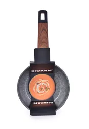 A tapadásmentes BIOPAN® WOODOO serpenyő Ø 16 cm kerámia SALT&PEPPER felülettel, amely a természetes kő imitációját idézi és SOFT TOUCH fogantyúval fából készült utánzattal rendelkezik. Minden főzőfelületen használható, beleértve az indukciót is. PTFE és PFOA mentes.