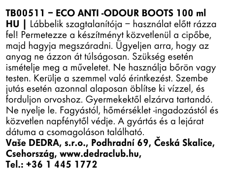A BOOTS egy kompakt eko spray, amely hatékonyan semlegesíti a kellemetlen szagokat a cipő belsejében – ahelyett, hogy csak elfedné azokat. Természetes összetevőinek köszönhetően kíméli a bőrt és a környezetet is. Ideális minden típusú cipőhöz: sport, munka, szabadidős és gyerekcipők.