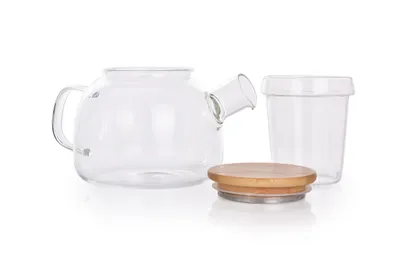 - üveg teáskanna borosilát üvegből, amely nehéz anyagok elkészítésére alkalmas gyógynövényes vagy gyümölcs teákhoz