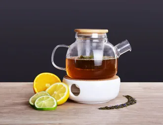 Stílusos üveg teáskanna 750 ml-es bambusz fedéllel és üveg szűrővel. Tartalmaz egy kerámia gyertyatartót is, amely melegen tartja az italt. Ideális teák, gyógynövények és gyümölcskeverékek számára.