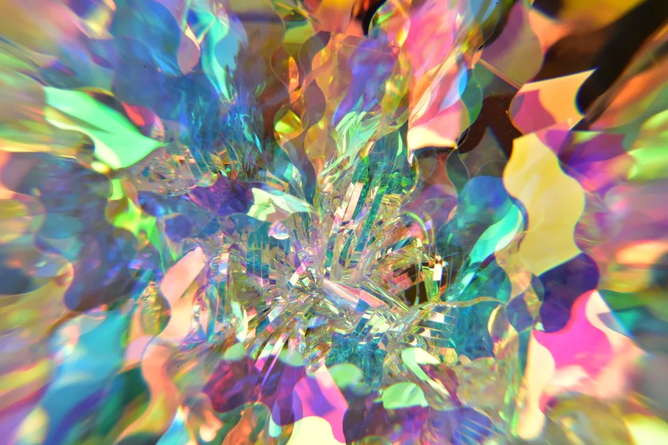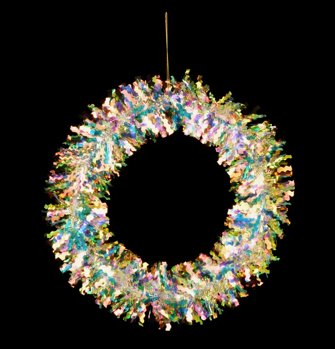 A BRILANTINO feltüntetett szivárvány koszorú, gyöngyházfényű hatással. Átmérő 33 cm, belső 18 cm. Különleges fóliából készült, amely a fényt a szivárvány színeire töri. Ideális karácsonyi dekoráció modern és klasszikus belső terekhez.