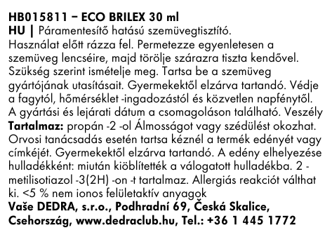 ECO BRILEX® 100 ml egy tisztító spray szemüvegekhez, párásodásgátló hatással, amely biztosítja a tökéletes kilátást és tiszta látást. Egy lépésben tisztít, políroz és ugyanakkor védőfilmet képez, amely megakadályozza a felületek párásodását. Ideális dioptriás és napszemüvegekhez, beleértve az árnyékoltakat is.