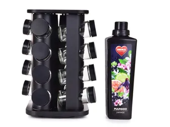 Elegáns 4 szintes forgatható fűszertartó (360°) 16 üveg fűszeres üveggel 90 ml-es. A csiszolt rozsdamentes acél és a fekete felület kombinációja - praktikus, helytakarékos és stílusos kiegészítő a konyhába.