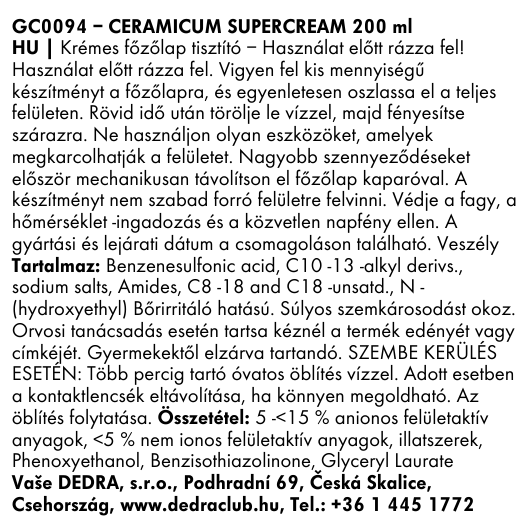 A CERAMICUM 2v1 szuperkrém egy intenzív tisztító- és fényesítőkrém, amely megbízhatóan eltávolítja a zsírt, megégett anyagokat és szennyeződéseket a kerámia és indukciós főzőlapokról karcolás nélkül. Finom mikrorészecskéket tartalmaz, amelyek hatékonyan kezelik a makacs szennyeződéseket, de kíméletesek az érzékeny felületekkel.
