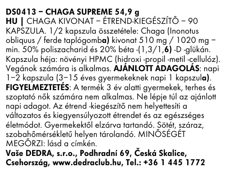1 kapszula összetevői: Chaga (Inonotus obliquus/ferde nyárfa) kivonat 510 mg – minimum 50 % poliszacharid és 20 % béta-(1,3/1,6)-D-glükán. A kapszula burka: növényi kapszula HPMC (hidroxi-propil-metil-cellulóz).