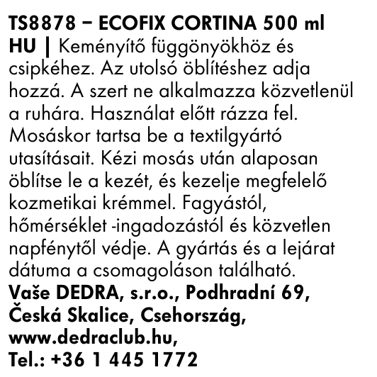CORTINA ECO FIX egy környezetbarát hajlító, amely a mosás utáni szálak finom megerősítésére tervezett. Segít helyreállítani és megőrizni a függönyök, csipkék vagy speciális textíliák elegáns formáját, anélkül, hogy a szövetek mesterségesen megkeményednének.
