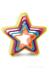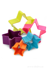 5 darab műanyag CREMO csillag formájú kiszúró készlet süteményhez, gyümölcshöz, zöldséghez vagy piskótához. Átmérő 4,5–10 cm, magasság 4 cm. Tartós műanyag, színek keveréke.