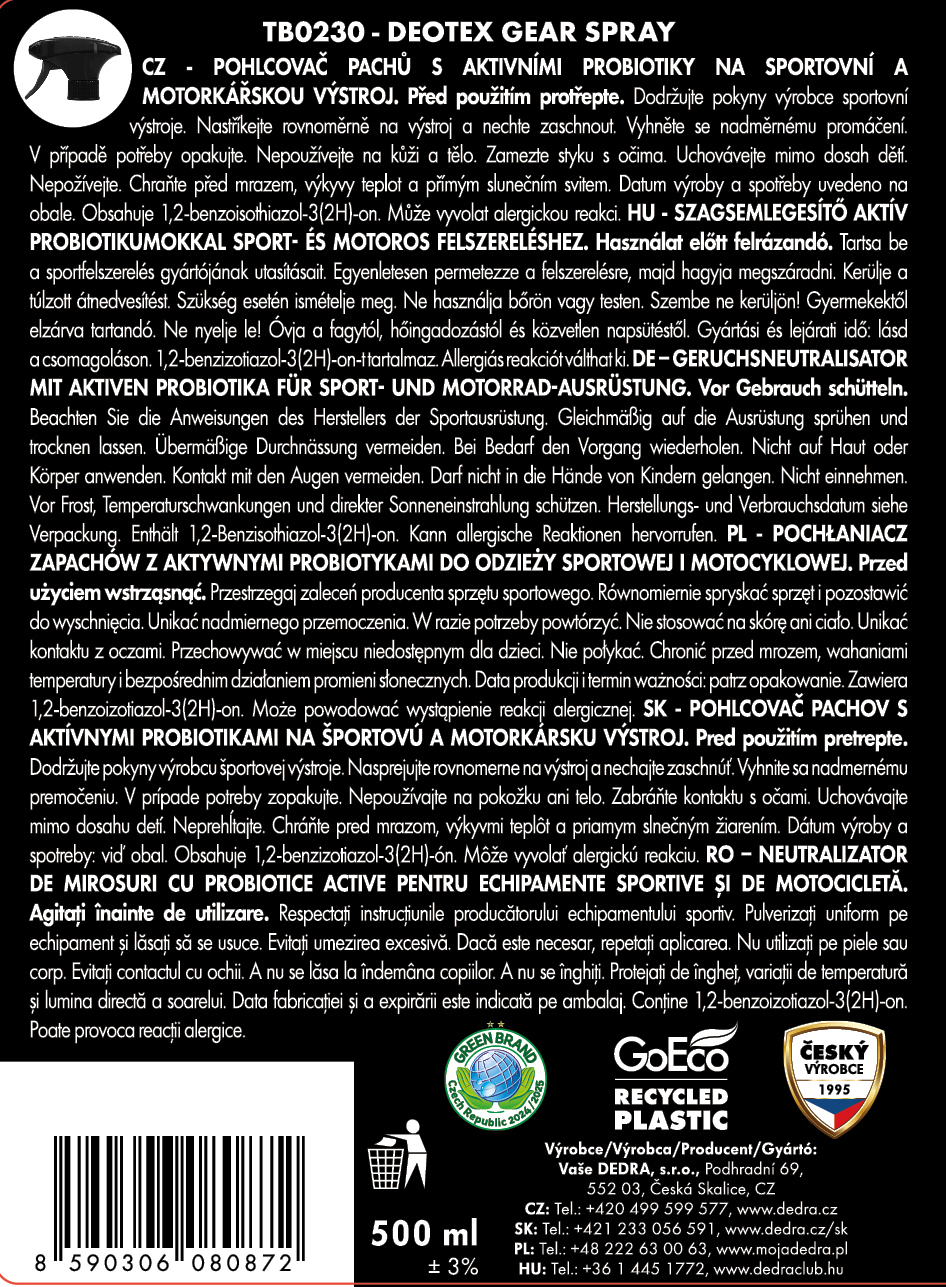 DEOTEX® GEAR 500 ml – probiotikus permet a sport- és motorkerékpáros felszerelés szagának megszüntetésére. Semlegesíti a szagokat, hosszú távú frissességet és higiéniát biztosít vegyszerek nélkül. Ideális sisakokhoz, védőfelszerelésekhez, dzsekikhez, hátizsákokhoz és egyéb felszerelésekhez. Gyorsan száradó összetevők, kíméletes az anyagokhoz és a bőrhöz.