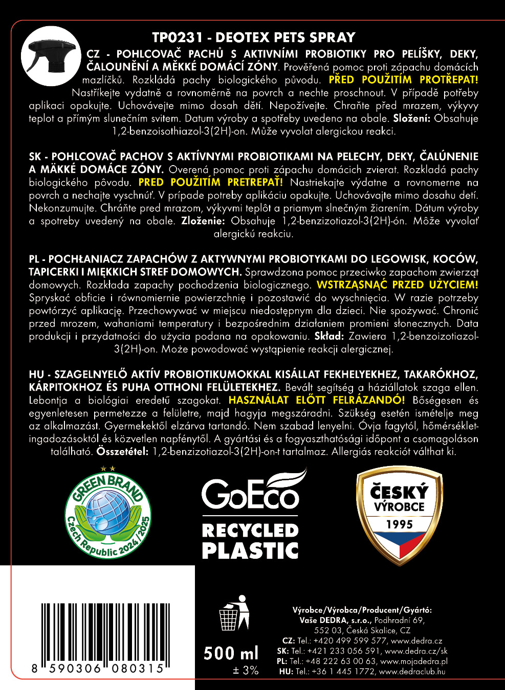A DEOTEX® PETS SPRAY 500 ml probiotikus spray hatékonyan semlegesíti az ágyak, takarók, kárpitok és a háziállatok puha területeinek szagát. Környezetbarát. A természetes probiotikumok baktériumszinten bontják le a szagokat. Biztonságos a háziállatok és gazdáik számára.