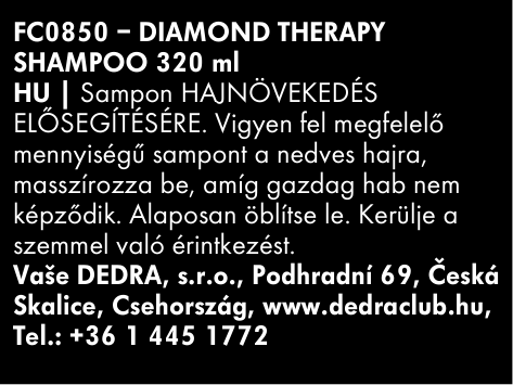 A DIAMOND THERAPY sampon kifejezetten a haj növekedésének támogatására és a hajhullás megelőzésére lett kifejlesztve. Ez a sampon fejlett aktív összetevőket kombinál, amelyek stimulálják a hajhagymákat, erősítik a hajat a hajgyökerektől a hajvégekig, és támogatják a haj egészséges növekedését. Az eredmény dúsabb, erősebb és egészségesebb haj.