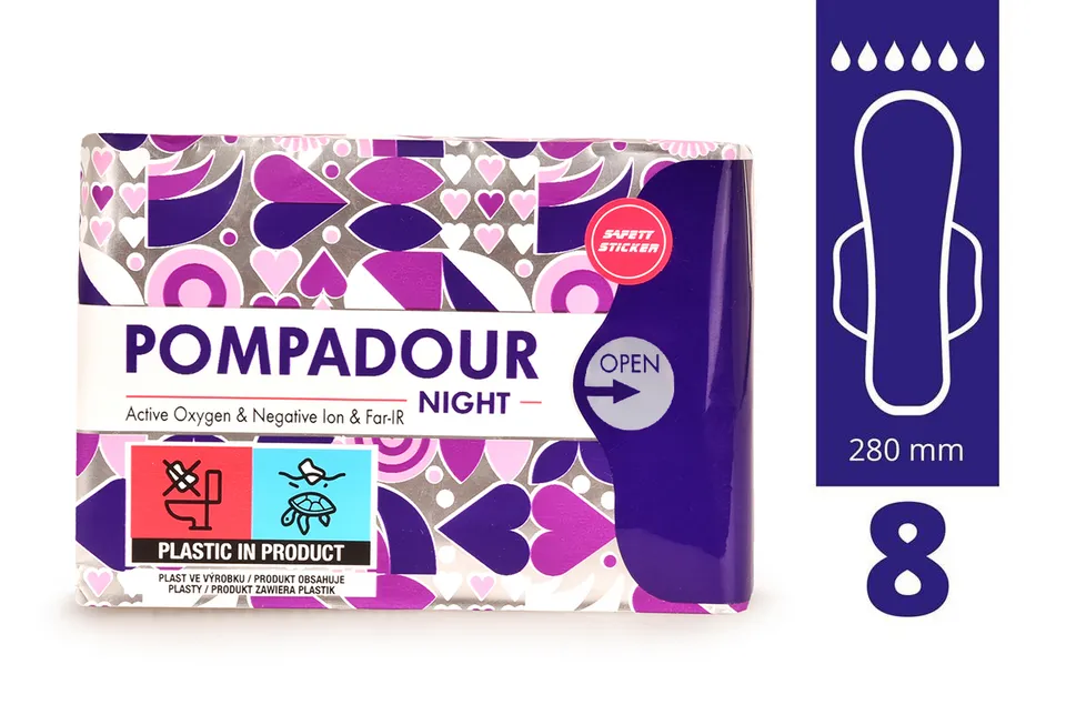 Tapasztalja meg az intim higiénia teljesen új standardját a POMPADOUR® NIGHT – új generációs női higiéniai betétekkel, amelyeket erősebb menstruációra és éjszakai használatra terveztek. Finom 100% pamutból készül, maximális kényelmet nyújtva, mindegyik betét külön csomagolt a tökéletes higiénia érdekében, és egyedi szinergikus chippel van kiegészítve, amely a hétköznapi védelmet aktív egészségügyi támogatássá alakítja.