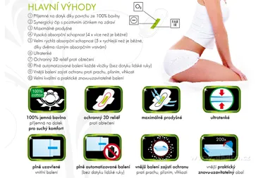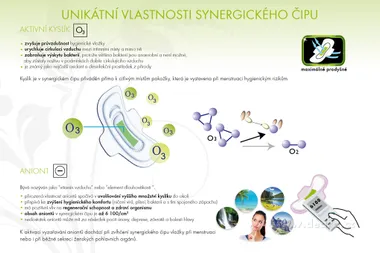 - Szinergikus chip, amelyet a test hőmérséklete és nedvessége aktivál, anionokat és aktív oxigént bocsát ki, amelyek megakadályozzák a káros baktériumok szaporodását, védik a jótékony mikroorganizmusokat, és támogatják az intim területek öntisztító képességét.