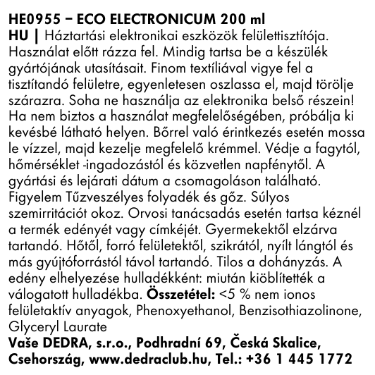 ECO ELECTRONICUM 200 ml kíméletes, de hatékony tisztítószer a fogyasztói elektronika felületeire, ideális TV-khez, monitorokhoz, laptopokhoz, hangszórókhoz, távirányítókhoz és egyéb eszközökhöz.
