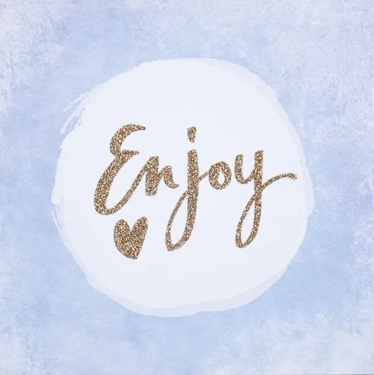 Az ENJOY TODAY falikép kék akvarell háttérrel és arany csillogó felirattal örömöt, könnyedséget és pozitív hangulatot hoz a belső térbe. Mérete 28 x 28 cm, finom csillogó hatással.